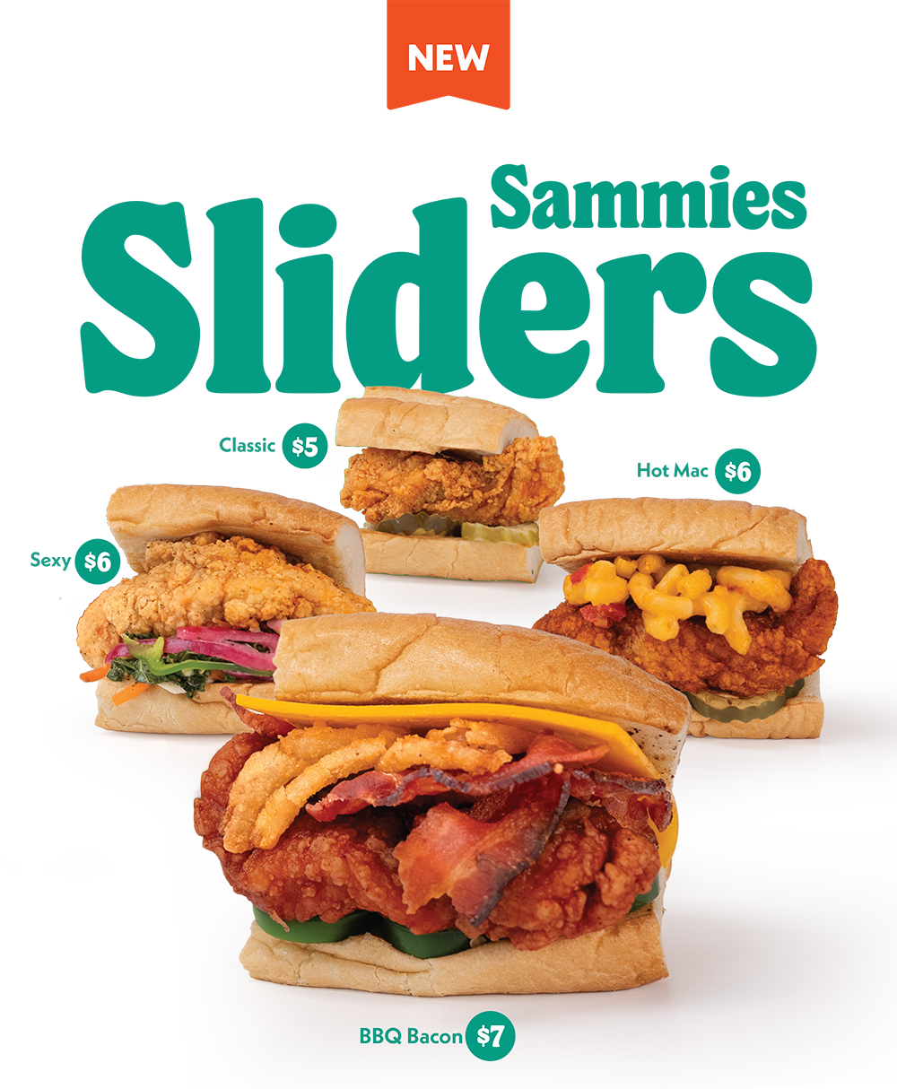 Two handed breaded tenders on a fresh brioche bun. From Classic to Sexy, our Sammies are built for the people. (Pro tip: Check out our Veggie Sam and get all the soul of fried chicken… without the chicken.)